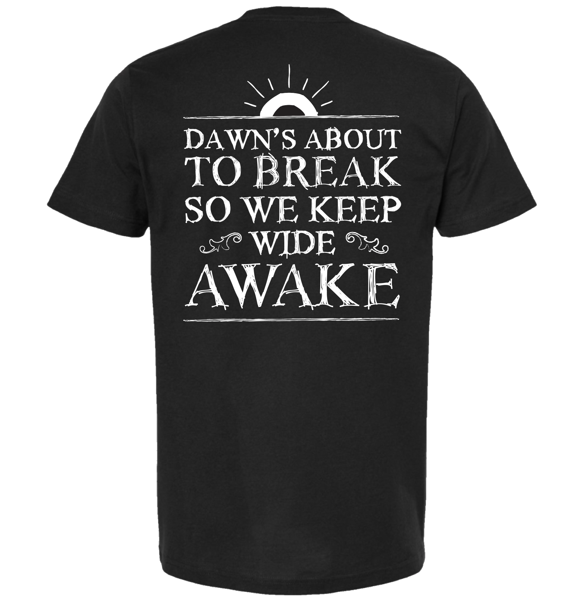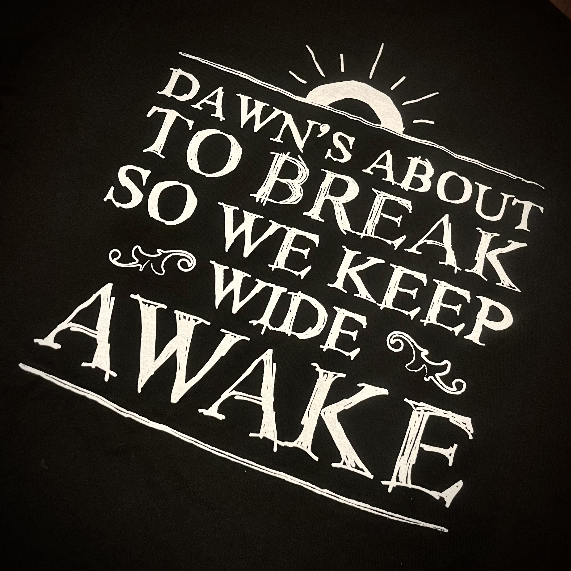 MESSMAKER Dawn’s About to Break So We Keep Wide Awake tee, on a Tultex Unisex Fine Jersey Tee: unmatched softness, a ribbed crew neck, double-needle stitching, and pre-washed to minimize shrinkage.